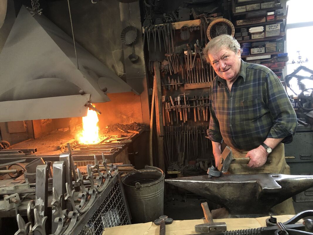 An der Esse und am Amboss wird er zum Künstler: »Mecki« Josef Hack, populär und bekannt wie kein anderer in Trochtelfingen, in seiner Schmiede. FOTO: BRÄUNINGER