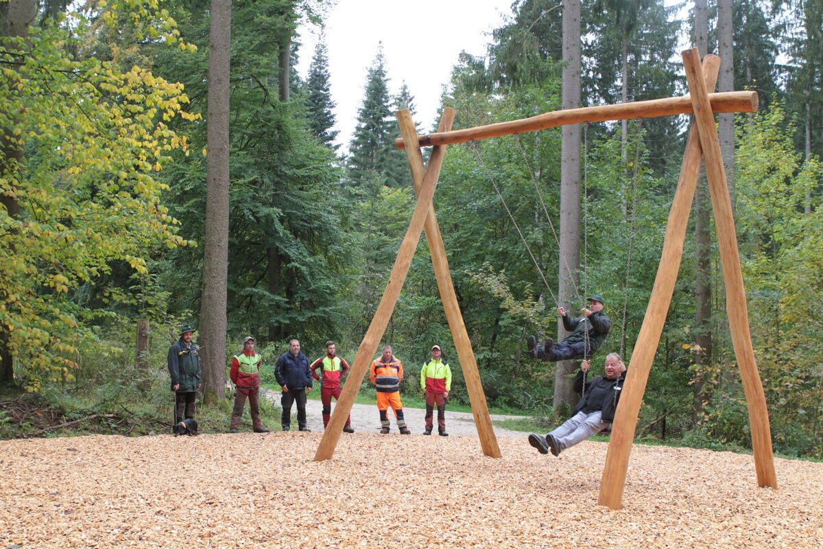 Martin Schuh und Jens-Peter Schmidt auf der Schaukel, die Waldarbeiter mithilfe des Bauhofs gebaut haben. FOTOS: SCHRADE