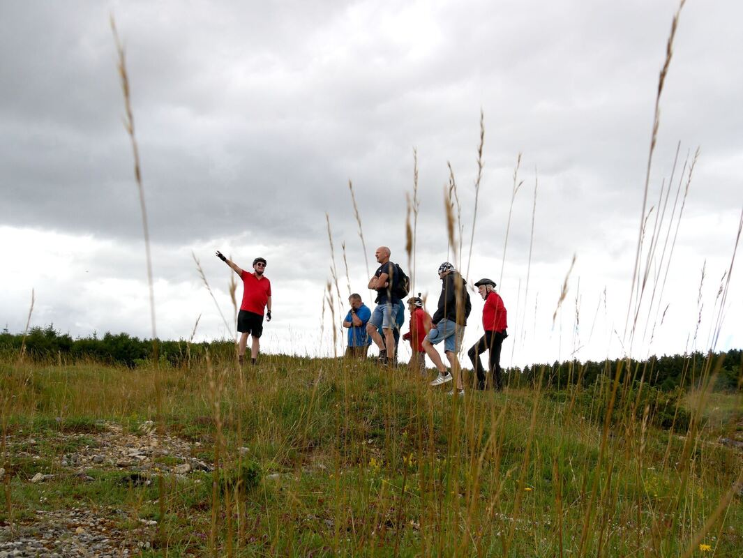 Am Rande und im Herzen des ehemaligen Truppenübungsplatzes gibt es viel zu sehen und zu erzählen. Joachim Lenk (rotes T-Shirt) führt die Teilnehmer unter anderem zum Sternenbergturm bei Böttingen und zu Hans-Gerhard Fink, der seinen schwäbischen Whisky im ehemaligen Munitionsdepot Ingstetten in edlen Fässern reifen lässt. FOTOS: FINK