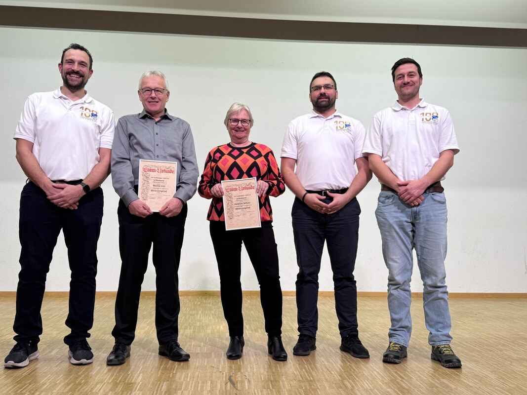 Die neuen Ehrenmitglieder Martin List und Heidrun Schulz mit den Vorständen Michael Hahn (links), Patrick Deh und Sascha Kurzenberger (von rechts).