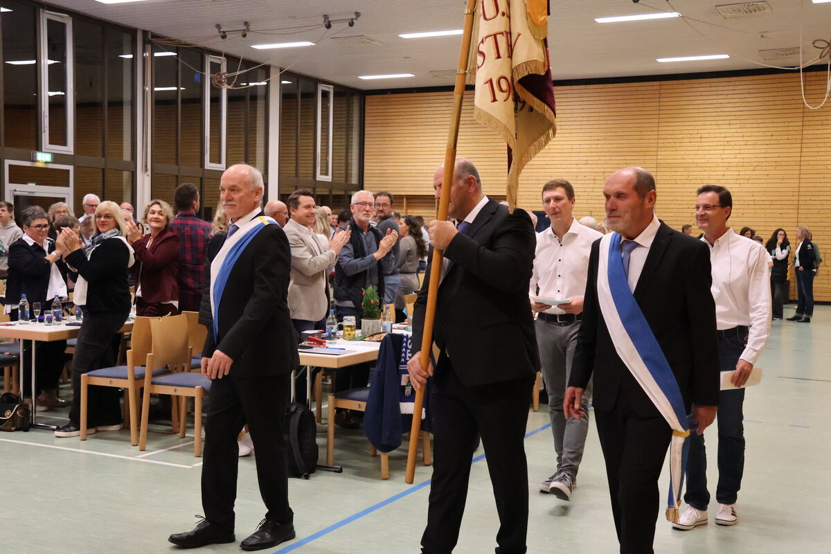 Großer Einmarsch mit der Vereinsfahne, getragen von Michael Hanker, links daneben Günther Heinzelmann und rechts Karl-Heinz Schmid, dahinter rechts Horst Burkhart mit Heiko Jaudas