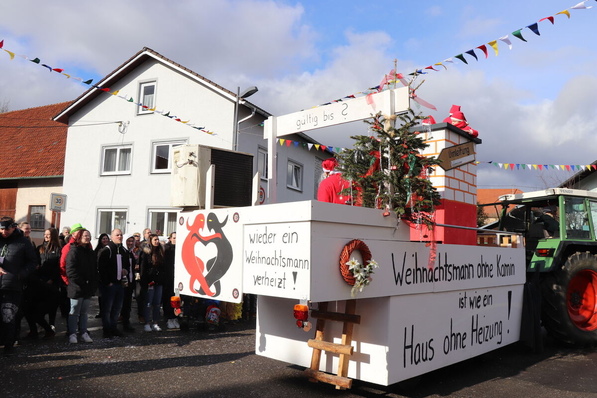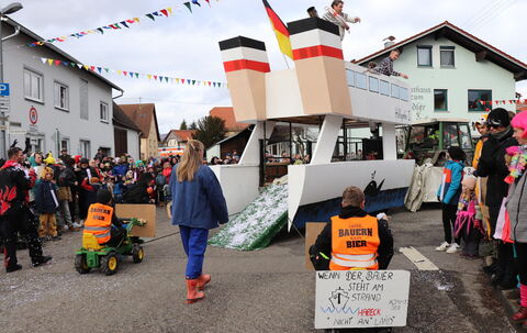 Vor allem der Streik der Landwirte und das Hin und Her der Ampel-Regierung beherrschte das Geschehen auf den Straßen: Weihnachtsmänner kritisierten Kaminofenstilllegungen, die Generation Z präsentierte sich in der Chill-Arena als »zu faul zum Arbeiten«, der Narrensamen nahm als Raumfahrer die Ampel mit zum Mond und schüttelte den Begriff »Regierung« um zu »Genug Irre«, die Pressefreiheit sowie der schmale Grat zwischen Fake News und Wahrheit wurden angeprangert und sogar eine Fähre war mit der Drohung unterwegs: »Geht’s dem Bauer um die Ähre, bleibt der Habeck auf der Fähre«. Die Eglinger nahmen wieder einmal kein Blatt vor den Mund, schafften es sogar, ihren Bürgermeister als »Däfeles-Bua« zu verpflichten. Denn Simon Baier konnte bei der Schultes-Absetzung eine an ihn gestellte Aufgabe nicht erfüllen und musste deshalb den Zug der Oberstetter Stöckberg-Hannes anführen. Vor dem frühmorgendlichen Kartoffelschälen hatte er sich jedoch erfolgreich gedrückt: »Ich bin ja abgesetzt und deshalb zu nichts verpflichtet«, redete er sich heraus.