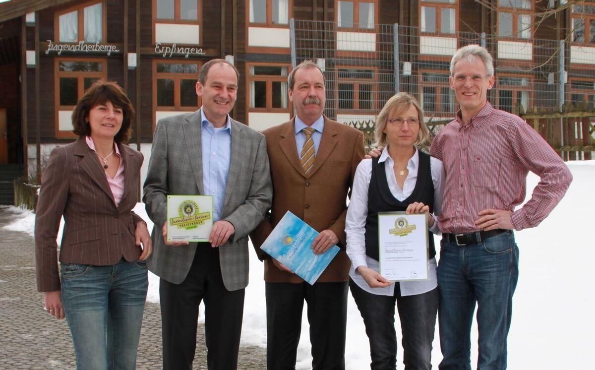 Freuen sich über die Auszeichnung (von links): Ute Hailfinger von der Touristinfo, Bürgermeister Uwe Morgenstern, Wolfgang Schütz von der Fremdenverkehrsgemeinschaft, Rainer und Petra Müller, Herbergsleitung in Erpfingen. FOTO: LEUSCHKE