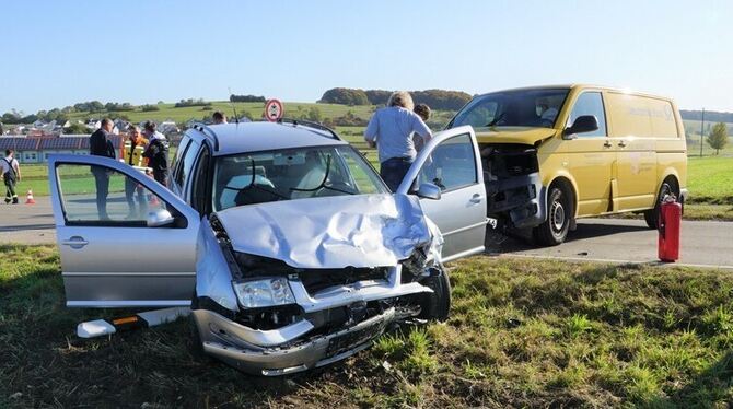 GENKINGEN/UNDINGEN. Bei einem schweren Verkehrsunfall auf der Landesstraße 382 zwischen Genkingen und Undingen mit insgesamt vier beteiligten Fahrzeugen sind am Montagmorgen fünf Personen verletzt worden, zwei davon schwer. Kurz vor 9.30 Uhr fuhr ein 18-jähriger Lenker eines VW Polo in Richtung Genkingen. Um links zur Zufahrt zum Rossberg abzubiegen, musste er wegen des Gegenverkehrs anhalten. Auch der 77 Jahre alte Fahrer eines VW Golf stoppte seinen Wagen ordnungsgemäß hinter dem Polo. Der 26-jährige Fahrer eines den beiden Pkw in größerem Abstand nachfolgenden VW-Transporters reagierte aber zu spät und krachte mit entsprechender Geschwindigkeit trotz eines Ausweichmanövers und eingeleiteter Vollbremsung mit Wucht ins linke Heck des VW Golf, der dadurch wiederum auf den Polo geschoben wurde.
