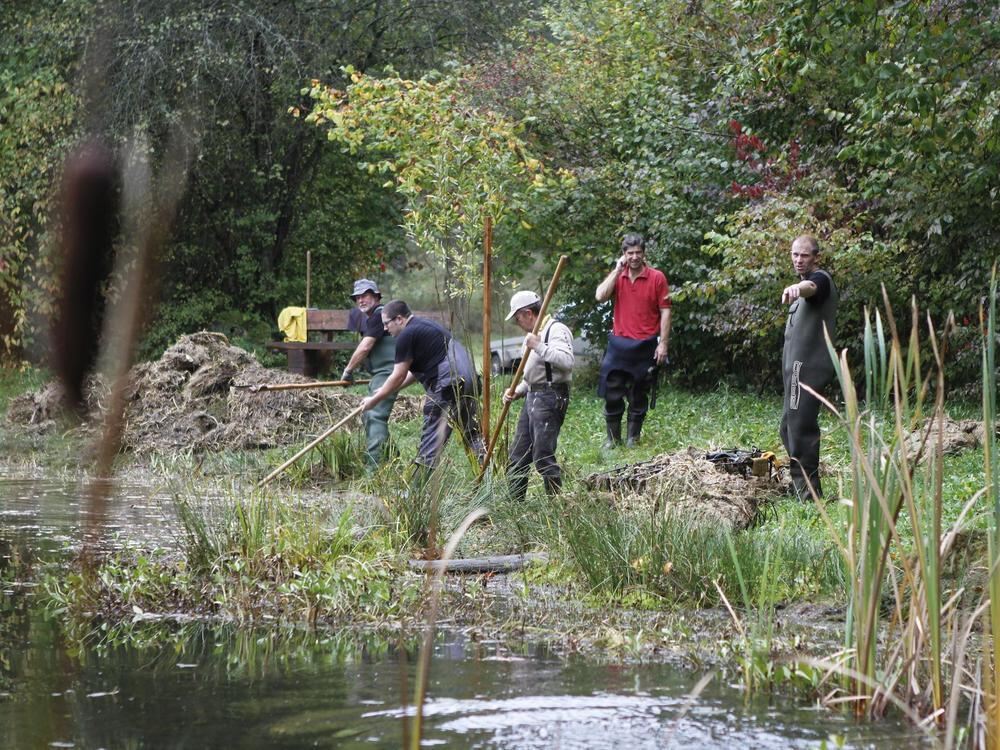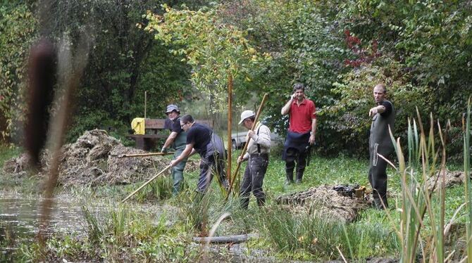 Nichtheimische Arten bringen das Biotop aus dem Gleichgewicht. Der Albverein pflegt den Wasserpflanzenteppich, die ausgesetzten Goldfische holt später ein Profi-Angler aus dem Froschteich bei Trochtelfingen. FOTO: LEUSCHKE