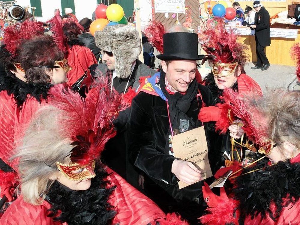 Faszinierende venezianische Masken umringen in Zwiefalten Ingo Hamberger mit Doktortitel »Dr. räl.«