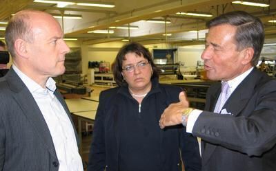 Ließen sich von Trigema-Chef Wolfgang Grupp (rechts) erläutern, wie sein Unternehmen erfolgreich Arbeitsplätze in Deutschland sichert: der Tübinger Bundestagsabgeordnete Winfried Hermann und die Grünen-Landesvorsitzende Petra Selg.