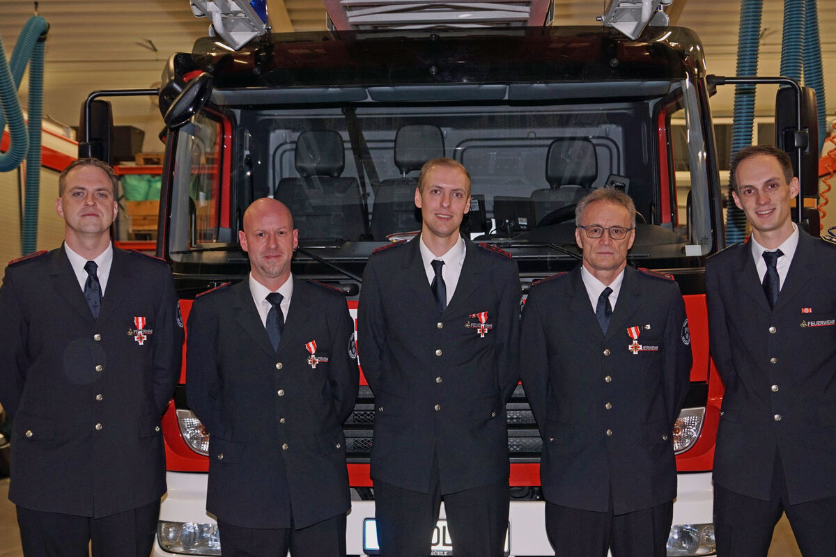Steffen Flitsch und Thomas Kley sind seit einem Vierteljahrhundert mit von der Partie. Dafür gab es von Belz’ Stellvertreter Marcel Dornbusch und Thomas Müller das Feuerwehr-Ehrenzeichen in Silber überreicht. Die bronzene Ausführung erhielt Heiko Geiselhart, der seit 15 Jahren bei der Feuerwehr ist. Außerdem standen sechs Beförderungen auf dem Programm. Feuerwehrmann wurden Johannes Köper und Emmanuel Grimm. Die Löschmeister-Schulterklappen gab es für Steffen Flitsch und Tobias Eben. Den Dienstgrad Oberlöschmeister haben jetzt Rainer Peter und Steffen Röhm. (lejo)