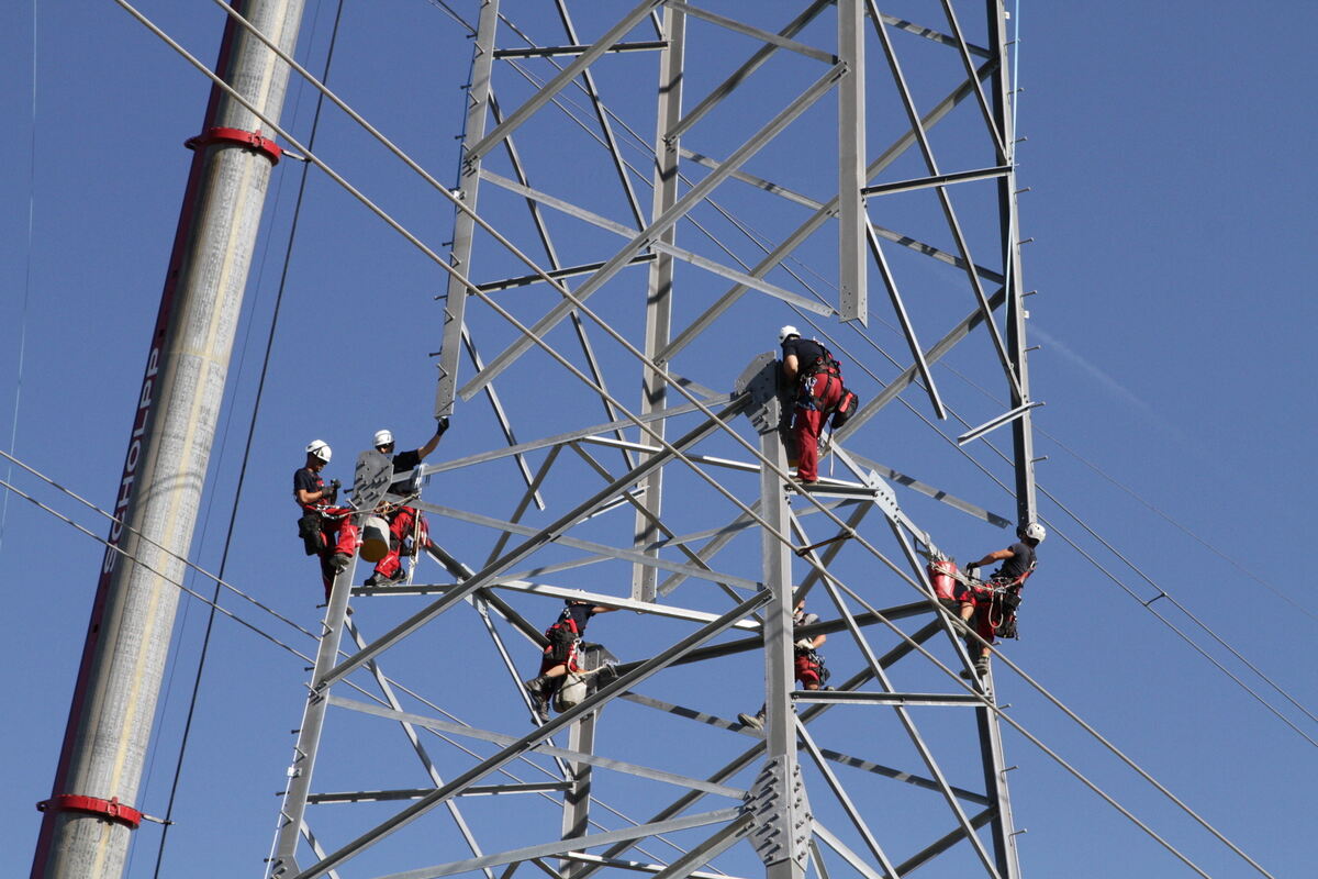 Die 55 bis 70 Meter hohen Strommasten wachsen Stück für Stück: Ein Kran hebt ein rund zwölf Tonnen schweres Bauteil in die Höhe und manövriert es durch das Netz der Leitungen hindurch. Freileitungsmonteure verbinden die einzelnen Elemente.Fotos: Schrade