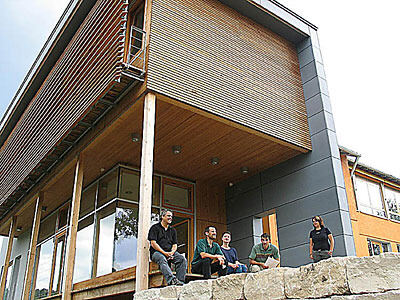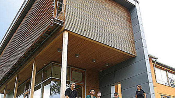 Holz aus heimischen Wäldern hat Architekt Thomas Bamberg (links) im Anbau an das Waldschulheim verwendet. Damit schafft er die Verbindung zur Arbeit, die Reiner Knecht, Hauswirtschaftsleiterin Gudrun Förster und Elmar Birnbichel hier leisten.