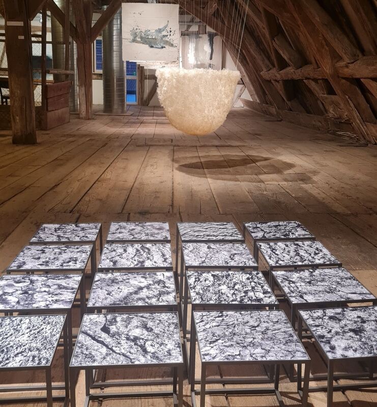 In der Münsinger Zehntscheuer ergaben Arbeiten dreier Künstler ein großes Ganzes. Vorn Fotos von Gert Wiedmaier, in der Mitte ein »Nest« von Angela Flaig aus Pflanzensamen und im Hintergrund ein Bild von Eva Doelker-Heim, die mit Erdpigmenten malt.