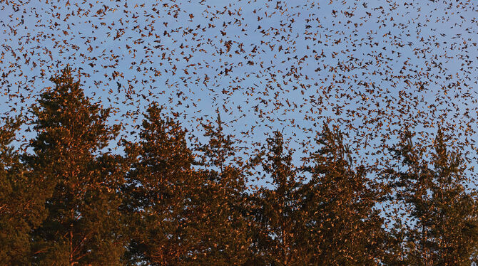 Wie von unsichtbaren Fäden gezogen und begleitet von einer ungeheuren Klangwolke: Die Bergfinken lassen sich auf ihren Schlafbäumen nieder.