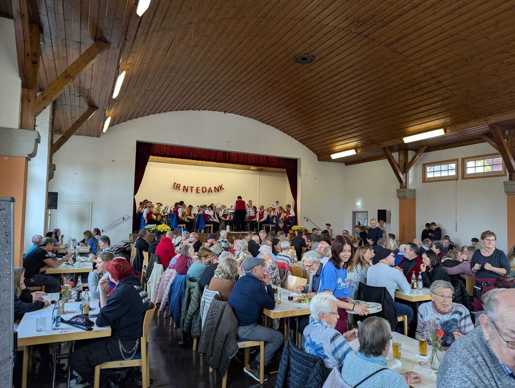 Im Anschluss ging das Feiern in der übervoll besetzten Festhalle in Mägerkingen weiter. Die Gemeinde war zur traditionellen Kirbe eingeladen – und folgte zahlreich. Zum Frühschoppen und Mittagessen spielten der Musikverein Mägerkingen und die Jugendkapelle (JuKa) schwungvoll auf und sorgten für beste Stimmung. Das Küchenteam unter der Leitung von Doro und Oli Kuhn verwöhnte die Gäste mit einem köstlichen Festessen: Schweinebraten mit Alb-Gold-Spätzle, das großen Anklang fand. Auch die Kuchentheke ließ keine Wünsche offen – ein buntes und leckeres Angebot, das mit viel Liebe von vielen Helfern vorbereitet worden war.