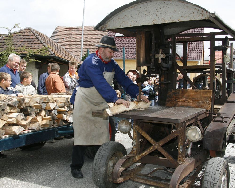 Bestaunenswert, das Holzsägen mit Maschinenkraft, die vor dem Zweiten Weltkrieg den Fortschritt bedeutete.