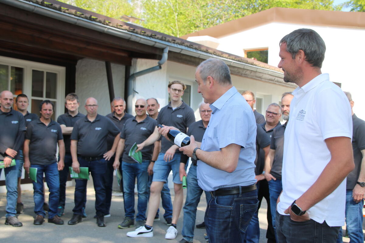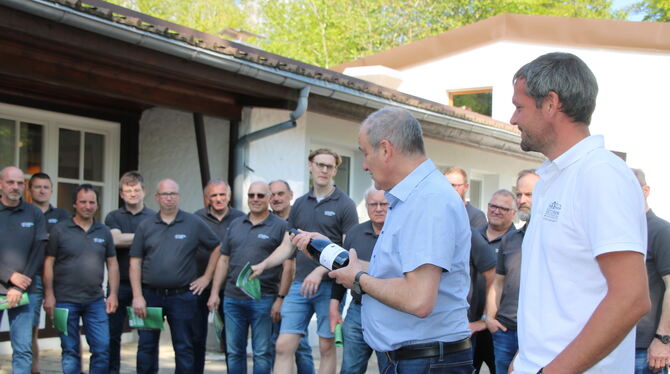 Bürgermeister Uwe Morgenstern als Auktionator: Gemeinsam mit Robert Bahnmüller von der Weingärtnergenossenschaft Metzingen-Neuhausen (rechts) versteigerte er drei Flaschen des eigentlich ausverkauften Bärenhöhlenweins.