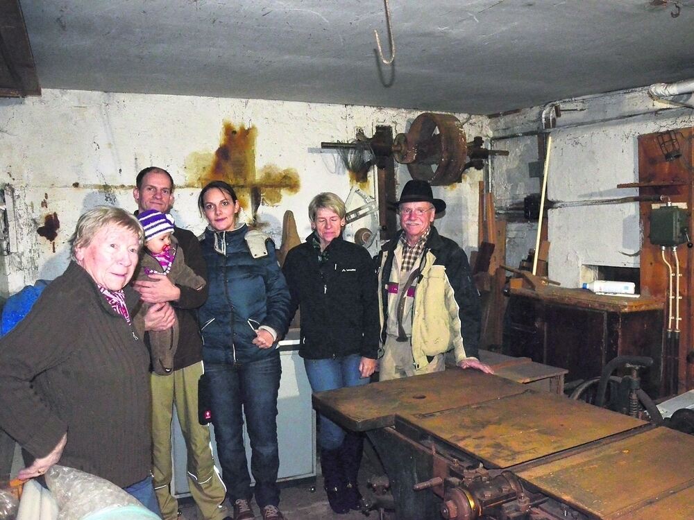 Mehrere Generationen der Familie Herrmann haben sich fürs Foto neben der historischen Kombi-Maschine versammelt (von links) Rose, Matthias mit Johanna, Nadine, Melitta und Karl Herrmann.