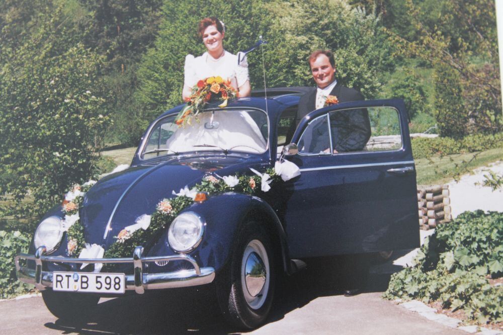 Käfer »Hänschen« war in desolatem Zustand, als Oliver Bez ihn aus seinem Dasein als Hühnerhaus erlöste. Gerade noch rechtzeitig zur Hochzeit des Sonnenbühlers wurde das Kultauto, Baujahr 1964, nach jahrelangen Restaurierungsarbeiten fertig. FOTO: PRIVAT