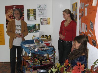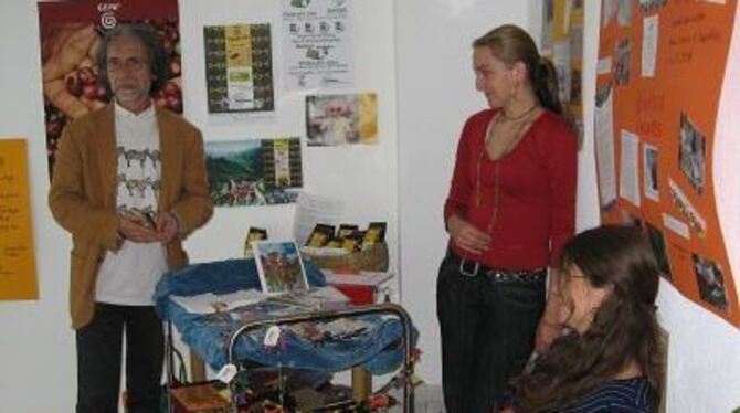 Dr. Heiner Lempp, Gründungsmitglied des Gammertinger Weltladens, zusammen mit ehrenamtlichen Mitarbeiterinnen beim Infostand, der zum Jubiläumsfest im Fidelishaus aufgebaut war.