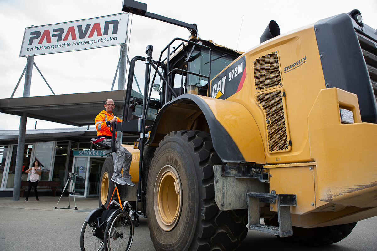 Ein Lift befördert Rafael Spitz vom Rollstuhl hinauf ins Führerhaus seines Caterpillars. Der Rollstuhl wird mitverladen, damit der 45-jährige Baumaschinenführer jederzeit selbstständig wieder aussteigen kann. FOTOS: PR