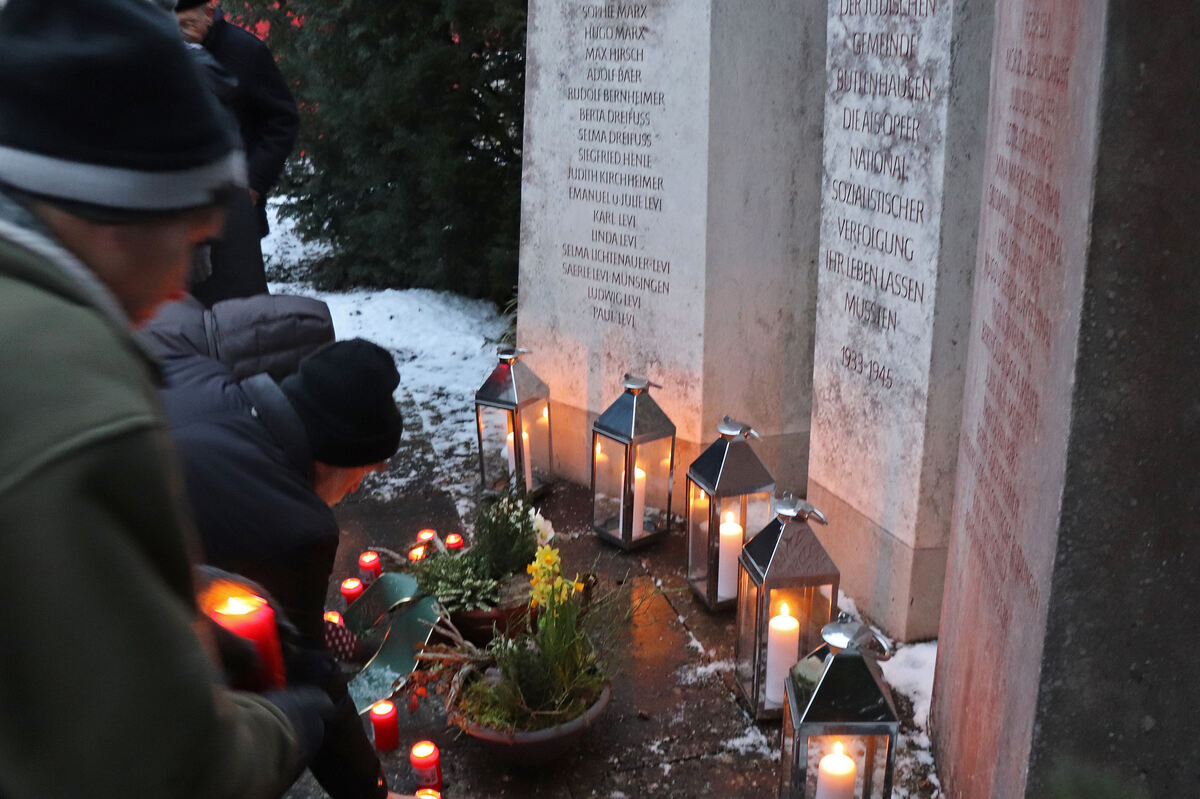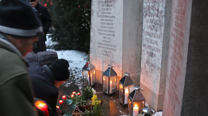Am Denkmal der Deportation in Buttenhausen wurden bei der Gedenkfeier Kerzen zur Erinnerung und Mahnung aufgestellt. FOTO: BLOCHING