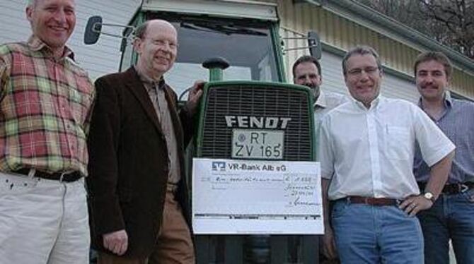 1650 Euro für die Kinderkrebshilfe Tübingen haben die Genkinger Nebenerwerbslandwirte bei der Eröffnung ihrer Maschinenhallen gesammelt. Die Sprecher der vier Hallengemeinschaften übergaben den Scheck (v. l.): Bruno Herrmann, Hans-Werner Stahl vom Tübinger Förderverein, Erwin Herrmann, Siegfried Herrmann und Günther Schanz. GEA-FOTO: PS