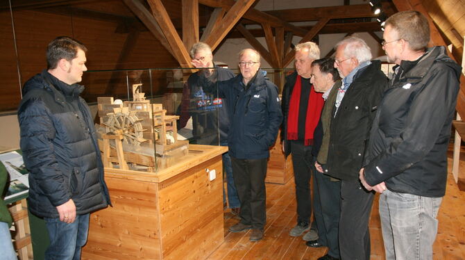 Am Modell erläutert Rainer Loose (Dritter von links) den angehenden Mühlenführern Funktion und Ausstattung einer Getreidemühle. FOTO: THUMM