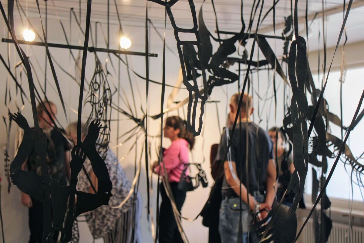 Texte von insgesamt zwölf Lyrikerinnen und Lyrikern, die regelmäßig im Atelier in Buttenhausen an ihrer Poesie feilen, treten in schlichter und klassischer Präsentation an den Wänden der Ausstellungsflächen vor allem in einen inhaltlichen Dialog mit Holzzeichnungen, Cut-Outs und einer eigens für die Schau entstanden und raumeinnehmenden Installation von Nina Joanna Bergold. Die Ludwigsburgerin studierte Freie Kunst an der Stuttgarter Kunsthochschule und ist in unterschiedlichen Techniken zu Hause. Von der Zeichnung ausgehend entstehen unter anderem ihre oft monumentalen Installationen, die wie Scherenschnitte in Teichfolie oder auch Korkfolie geschnitten werden. In der Ausstellung zu sehen ist die Installation »Meet me at the monkey bars« (Begegne mir am Klettergerüst), die aus einem Stück besteht und filigran in Korkfolie geschnittene Formen zu einer mehrperspektivischen, inneren Wimmelschau verbindet. Im Raum treten vier Texte ins Gespräch mit der Installation und eröffnen dem Betrachter unterschiedlichste Erzählstränge und Interpretationsmöglichkeiten.
