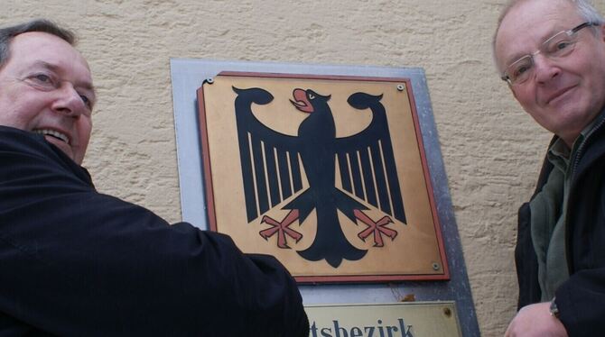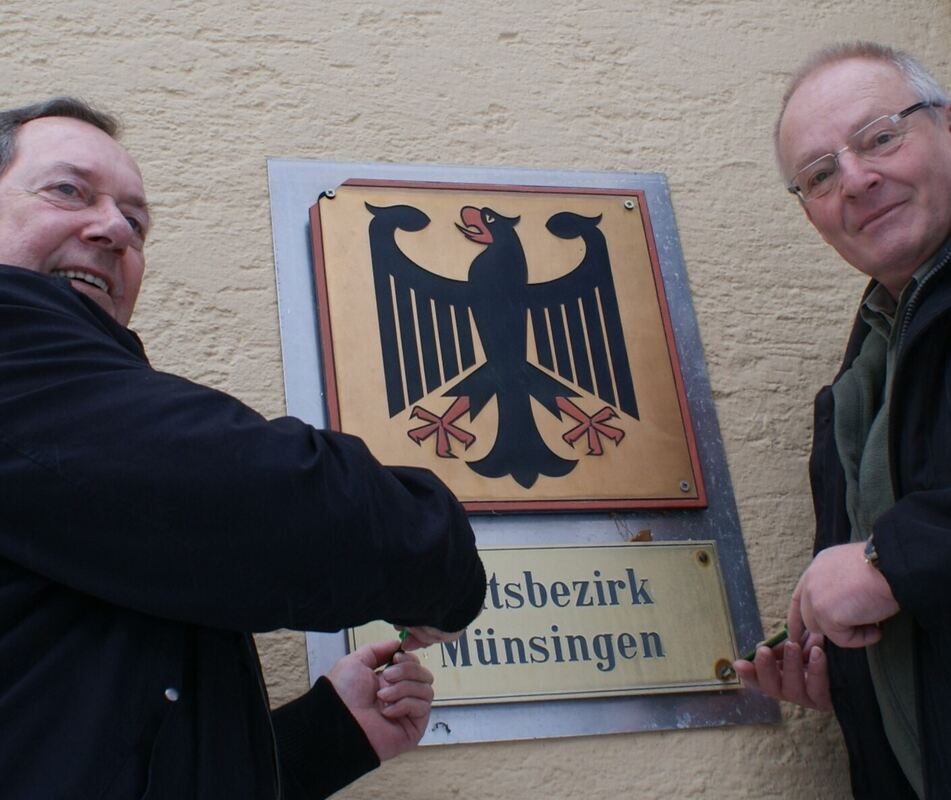 Bezirksvorsteher Horst Medrow (links) und Geschäftsführer Willi Börgmann schraubten am 30. Dezember 2010 das Gutsbezirk-Schild am Verwaltungsgebäude in Auingen ab.