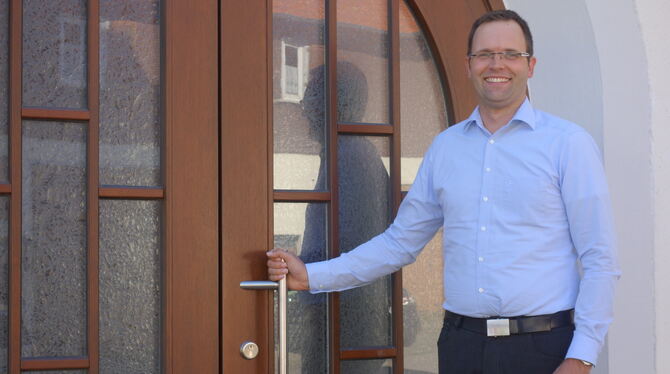 Undingens neuer Pfarrer Simon Wandel an der Pforte der Kirche »Unserer lieben Frau und Sankt Nikolaus«. Foto: Geiger