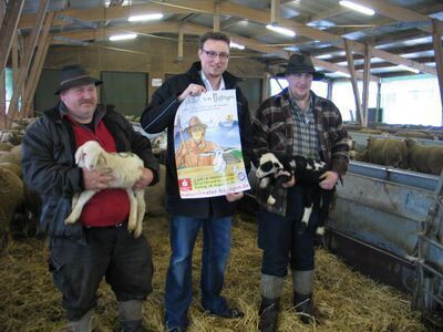 Schäfer Ernst Fauser, links, und sein Sohn Stefan bringen zur Premiere am 5. Juli einige Schafe nach Hayingen mit. Naturtheater-Geschäftsführer Marc-Philipp Knorr zeigt vom neuen Stück schon mal die Plakate.