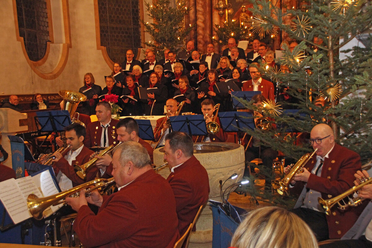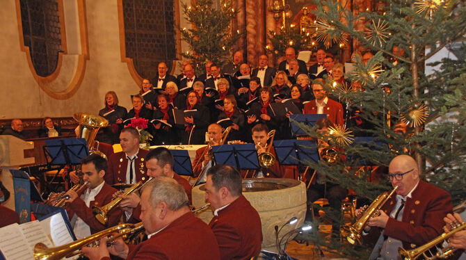 Die Schwäbische Alb Musikanten unter Leitung von Georg Bussmann sowie der Kirchenchor der St. Martinskirche mit seinem Leiter Günter Polanz begeisterten die Zuhörer bei ihrem Weihnachtskonzert. FOTO: LEIPPERT