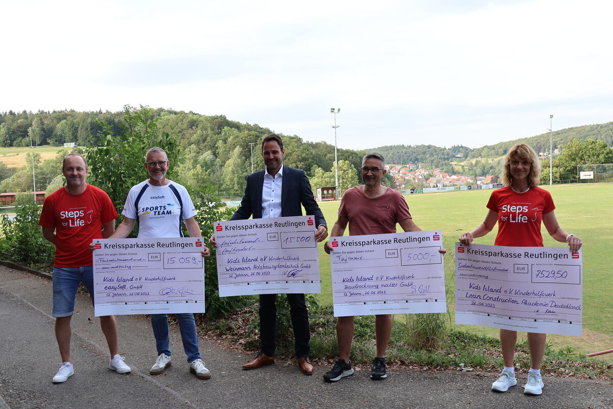 Habhafte Schecks für einen guten Zweck (von links): Jochen Reichenecker (Steps for Life), Andreas Nau (Easy Soft Metzingen), Aaron Oschwald (Weinmann Lonsingen), Michael Wild (Bautrocknung Matter), Susanne Nau (Steps for Life) hält den Scheck der Lean Construction Akademie Deutschland in den Händen. FOTO: BIMEK
