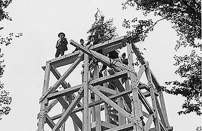Luftiger Arbeitsplatz: Vor einem halben Jahrhundert zog Zimmermann Karl Vöhringer (Bernloch) mit seiner Mannschaft den Aussichtsturm auf dem Sternberg hoch. Am Samstag, 28. Juni, 14 Uhr, feiern die Gemeinde Gomadingen und der Albverein das Jubiläum.