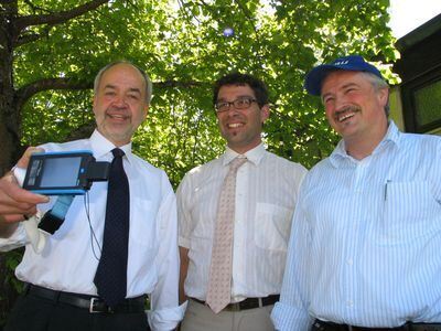 Landrat Thomas Reumann (von links), der Nabu-Landesvorsitzende Dr. André Baumann und Nabu-Präsident Olaf Tschimpe sind von den Vorzügen des GPS-Wanderns mit dem »Alb-Entdecker« restlos überzeugt.