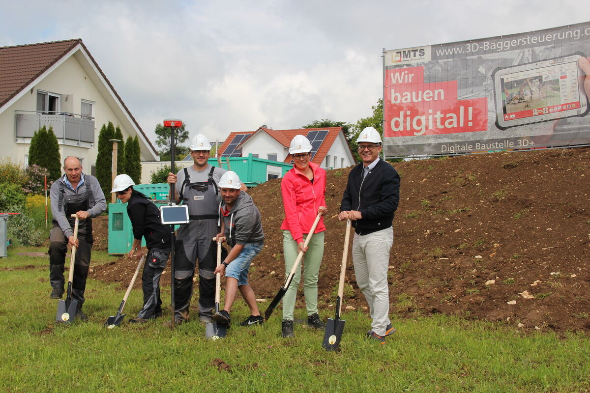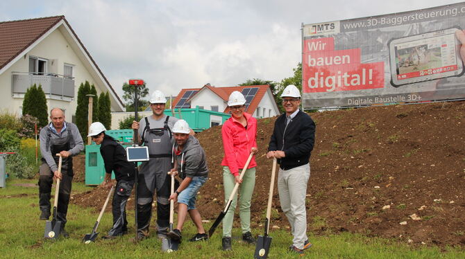 Im Baugebiet Hofweg legen sich beim symbolischen ersten Spatenstich ins Zeug (von links): Gerhard Braun (Wasserversorgung) und Sandra Haug (Kläranlage), Klaus Schnitzer, Polier beim Bauunternehmen Schrode, sein Kollege Michael Reichenecker, Ulrike Volk vom Ingenieurbüro Reik und Bürgermeister Jochen Zeller. FOTO: DEWALD