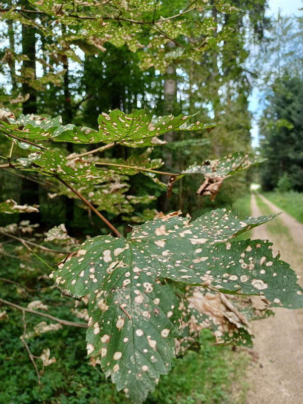 Viele Ahornbäume wurden in diesem Sommer von Pilzen befallen. Dieses Exemplar an einem Weg zwischen Hohenstein und Gomadingen leidet an der Weißfleckigkeit.