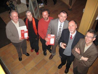 Autoren und Herausgeber mit dem Band »Geschichte und Biosphäre« im Bürgerhaus Münsinger Zehntscheuer: von links Professor Rainer Loose, Mössingen, Iris Fromm-Kaupp, Tübingen, Dr. Guntram Gassmann, Tübingen, der Esslinger Kreisarchivar Manfred Waßner, Professor Sönke Lorenz, Tübingen, und der Kirchheimer, vormals Münsinger Stadtarchivar Dr. Roland Deigendesch.
