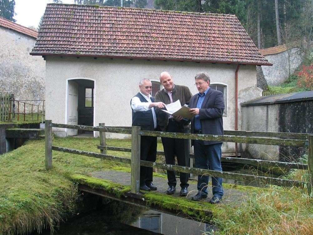 Im Jahr 2006 gründeten Elmar Reitter (links) und Karl-Wilhelm Röhm (Mitte) eine private Initiative zur Reaktivierung des alten Pumpwerks an der Lauterquelle in Offenhausen. Rechts im Bild: der Gomadinger Bürgermeister Klemens Betz.