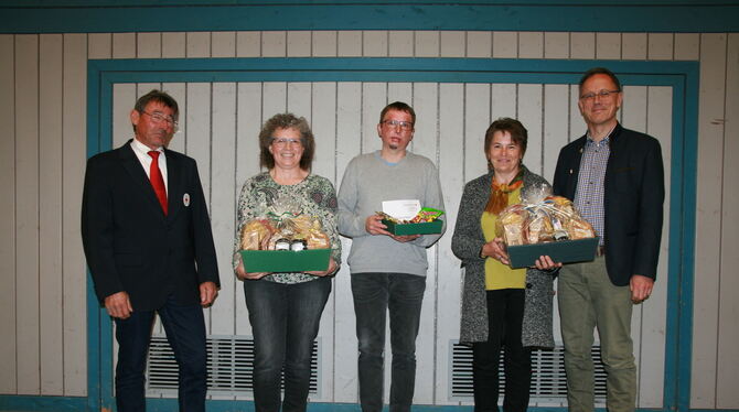Verdiente Aktive wurden ebenfalls ausgezeichnet. Dabei war Manuel Schwendele, seit 20 Jahren im Dienst des DRK und als Helfer vor Ort aktiv. Bettina Hepp ist seit 35 Jahren im DRK engagiert und seit 2006 Kassenführerin. Seit 40 Jahren ist Roland Arnold im Dienst des DRK, davon elf Jahre als Bereitschaftsdienstleiter. Ebenfalls seit 40 Jahren ist Gertrud Stefan beim Roten Kreuz dabei, auch sie zeitweise als Bereitschaftsleiterin. Kreis-Präsident Mahler und der bisherige Vorsitzende Schwendele überreichen jeweils Urkunden, Gutscheine oder Geschenkkörbe und Auszeichnungsspangen.