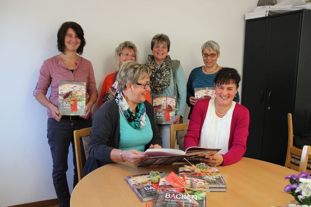 Herbstlich hübsch verpackt für die Bäckerinnen. Die Landfrauen präsentieren ihr Backbuch. Vorne Maria Knoll (links) und Pia Münch, dahinter (von links) Birgit Klocker, Claudia Leibfritz, Doris Bazlen und Konny Rehm.