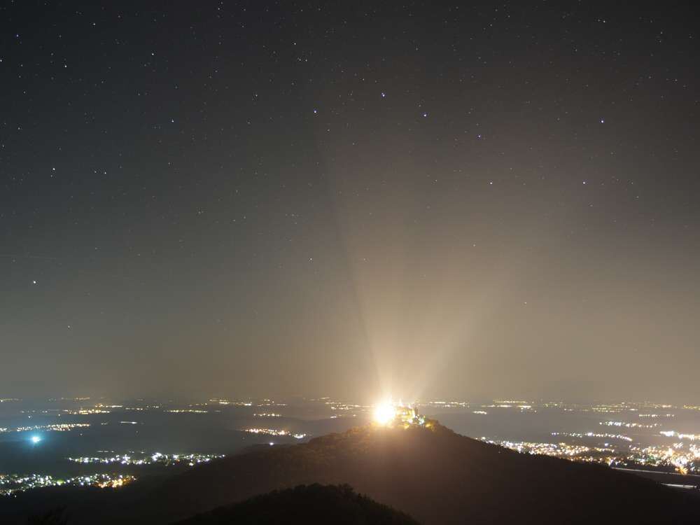 Lichtverschmutzung in der Region: Gegen die Dauerbeleuchtung von Siedlungen und Gebäuden (auf dem Foto das Schloss Hohenzollern) setzen sich selbst markante Sternbilder wie der Große Wagen (oben rechts) nur mit Mühe durch. FOTO: TILL CREDNER/ALLTHESKY.COM
