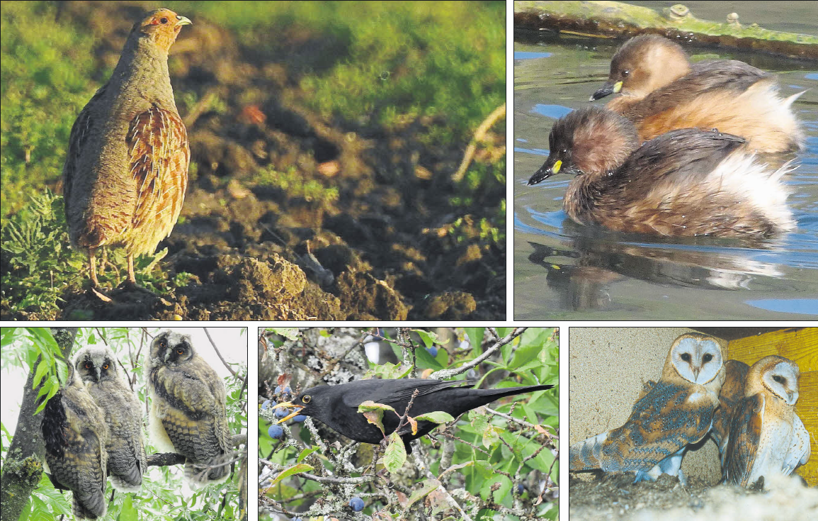 Alle fünf Kandidaten für die Wahl des Vogels des Jahres 2026 (im Uhrzeigersinn): das Rebhuhn, der Zwergtaucher, die Schleiereule, die Amsel und die Waldohreule. Günter Künkele – Kenner der Tier- und Pflanzenwelt auf der Alb – hat alle fünf Vogelarten schon vor der Kamera gehabt.