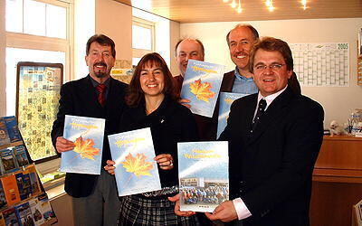 Freuen sich über den neuen Hayinger Stadt-Prospekt (v.l.): Bürgermeister Robert Riehle, Verkehrsamtsleiterin Elfriede Braunger, Franz Kloker und Johannes Tress vom Verkehrsverein sowie Paravan-Chef Roland Arnold.