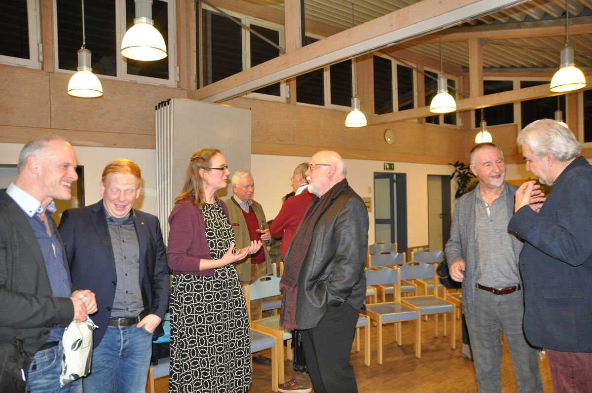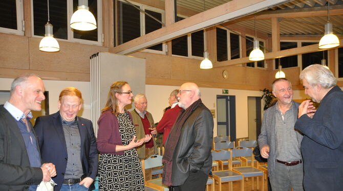 Thomas Poreski (von links), Gerald Müller, Irina Ose, Michael Scheiberg, Werner Hagmaier und Reinhard Gradmann im angeregten Gespräch in der Werkstatt an der Schanz. FOTO: BIMEK