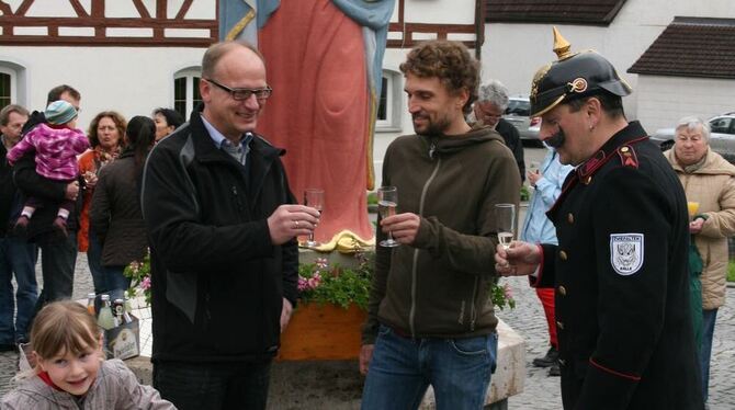 Großer Empfang und Gratulation für den Weltmeister Richard Widmer aus Baach (Mitte) von Bruno Auchter (links) und Büttel Herbert Ott beim Marienbrunnen in Baach. FOTO: THUMM