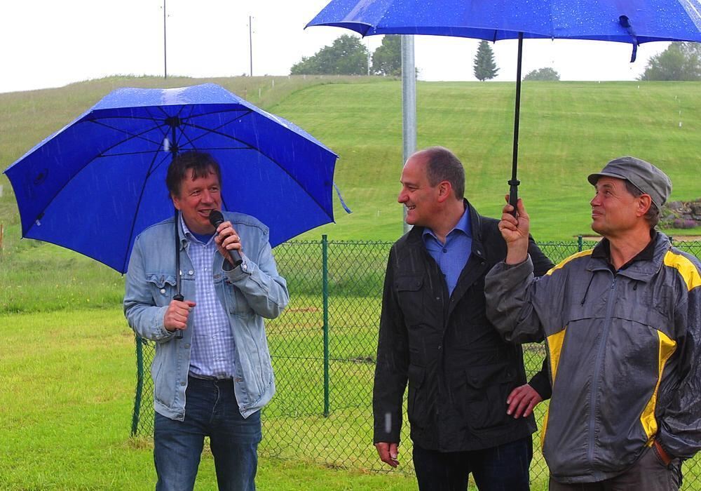Einen richtigen Wetterfrosch schreckt der Regen nicht: Launig plauderten Jörg Kachelmann (links) und Roland Hummel (rechts) mit Sonnenbühls Bürgermeister Uwe Morgenstern.