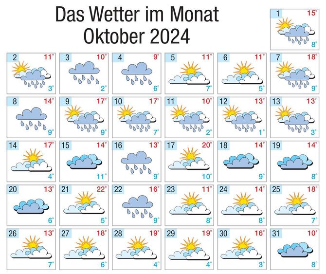 Mit einer mittleren Temperatur von 10 Grad war der Oktober 2024 um 2,3 Grad milder als normal (1991 bis 2020). Die Sonne schien nur während 82 Stunden (normal 113). Zehn Tage waren gänzlich sonnenscheinlos.