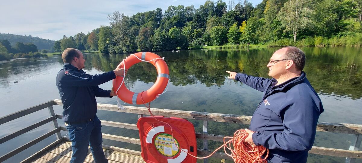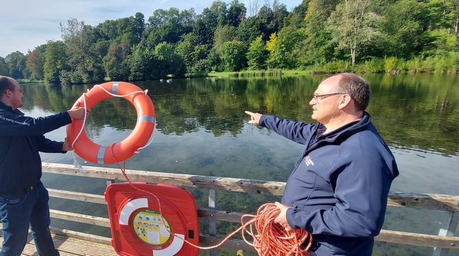 Klappe auf, Ring raus, werfen: Simon Bez und Eberhard Pilger demonstrieren, wie der Rettungsreifen geworfen wird. Wichtig: das Ende der Leine festhalten.