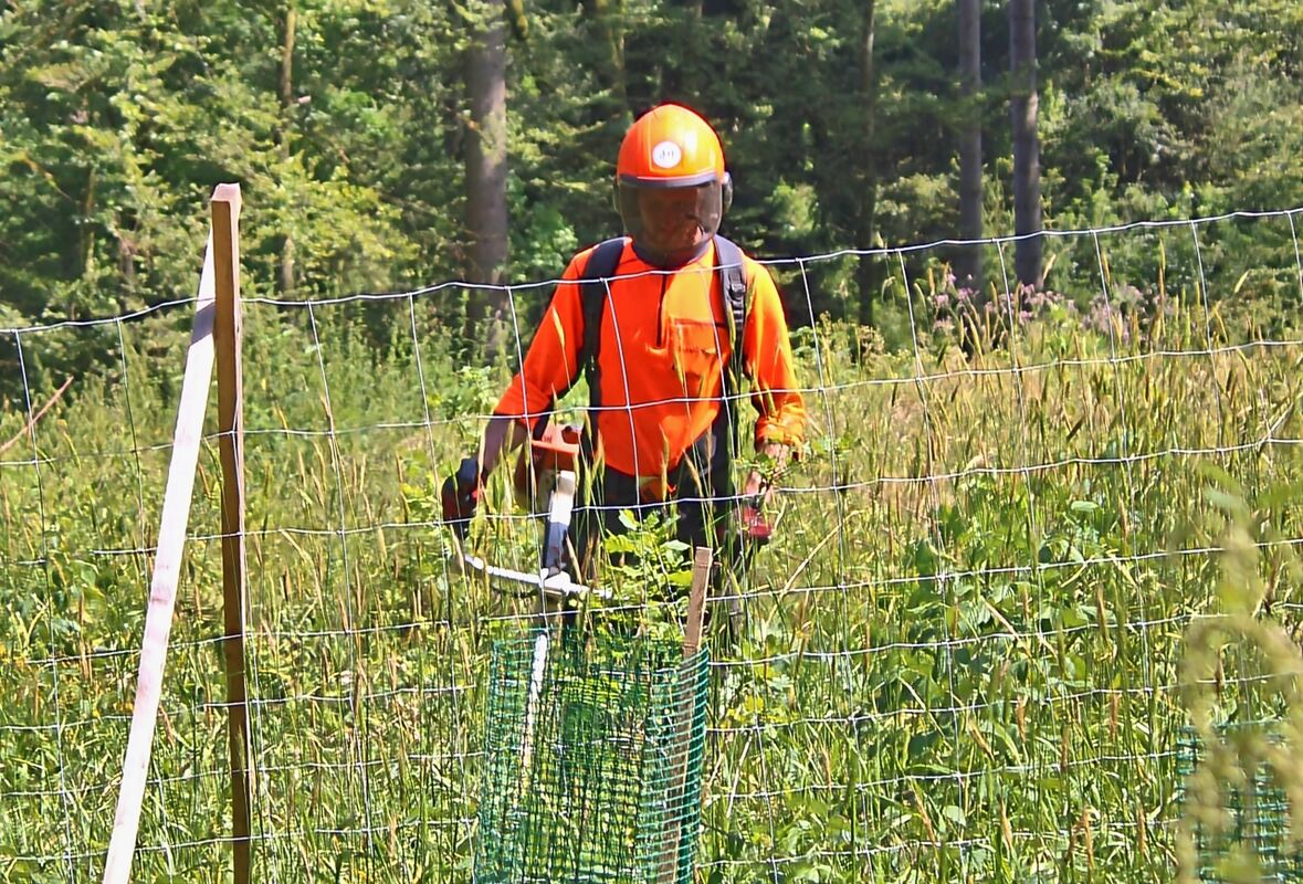 Ein Forstarbeiter hält mit der Motorsense und in Schutzkleidung den neu angepflanzten Eichen das Unkraut vom Leib.