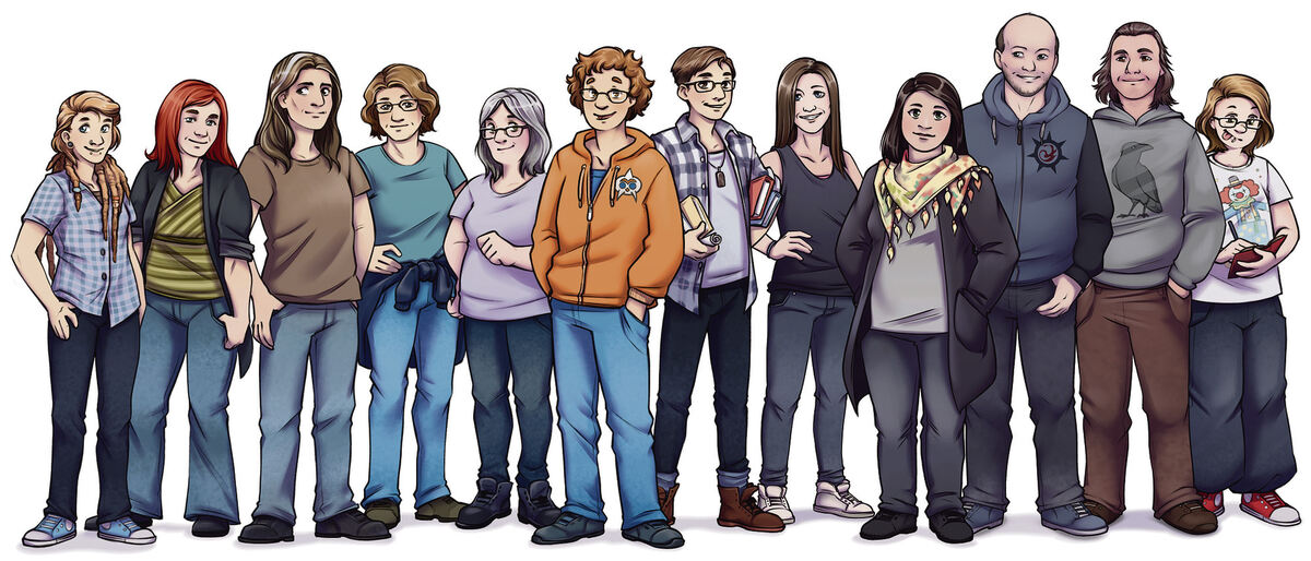 Das »School Craft«-Team, von der Illustratorin des Unternehmens gezeichnet. In der Mitte mit orangefarbener Jacke: Unternehmensgründer Fabian Röken aus Upfingen.illustration: school craft